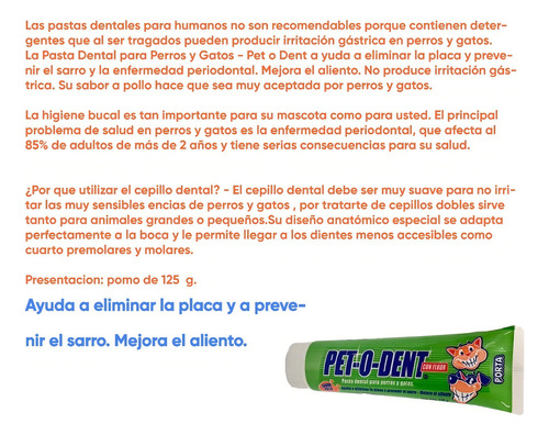La Pasta Dental Pet-o-dent es un aliado esencial para la salud bucal de tu mascota. Específicamente diseñada para perros y gatos, esta pasta dental con sabor a pollo contribuye a mantener los dientes limpios y libres de sarro.
